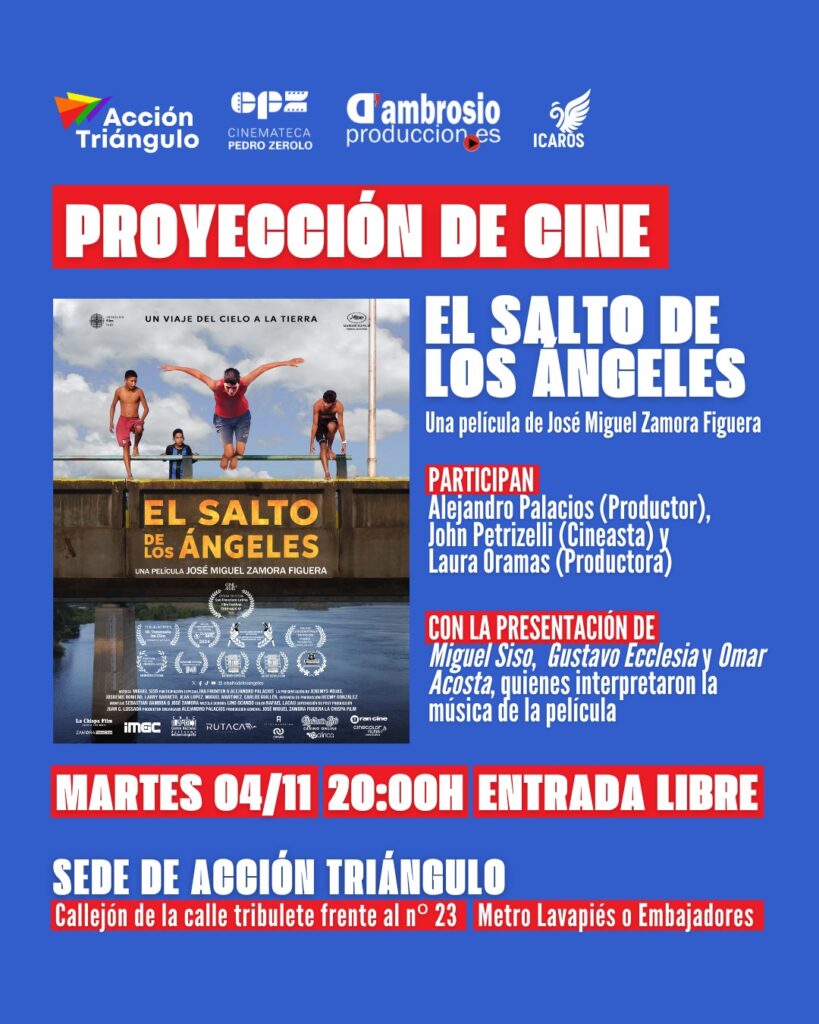 La película venezolana El salto de los Ángeles, del novel realizador José Miguel Zamora, se proyectará el 4 de noviembre a las 20:00 horas en Acción Triángulo, con la presencia de su productor Alejandro Palacios y un concierto en vivo de Miguel Siso, Gustavo Ecclesia y Omar Acosta, intérpretes de su música original.