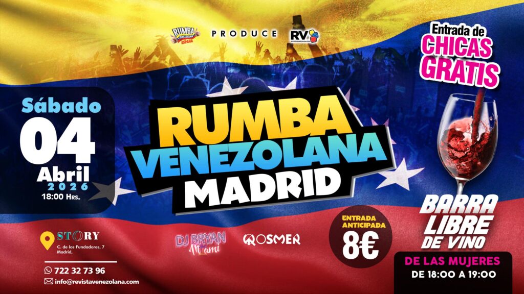 Evento: Rumba Venezolana en Madrid Fecha: Sábado 4 de abril de 2026 Lugar: Sala Story — Calle Fundadores 07, Madrid Hora de inicio: 18:00 horas DJs: DJ Osmer y DJ Brayan Animación: LEONIX Entrada mujeres: Gratuita Barra libre de vinotinto: De 18:00 a 19:00 horas (incluida para todos) Entrada individual anticipada: 8 euros por persona Mesa reservada anticipada: 60 euros (máximo 5 personas) Sorpresas: Confirmadas